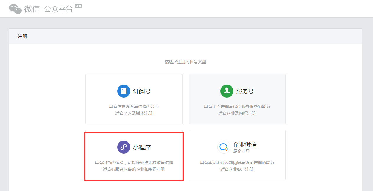 方法步驟:**步:進入微信公眾平臺的注冊界面,點擊“小程序”。(搜索“微信公眾平臺”即可)https://mp.weixin.qq.com/cgi-bin/registermidpage?action=index&lang=zh_CN