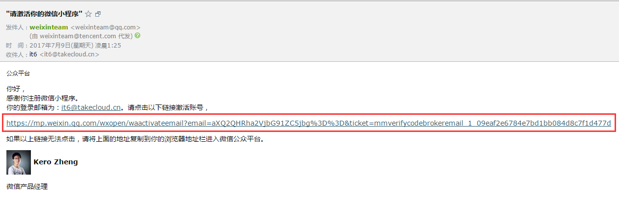 第四步:登錄注冊郵箱后,點開微信團隊的郵件,點擊激活鏈接。