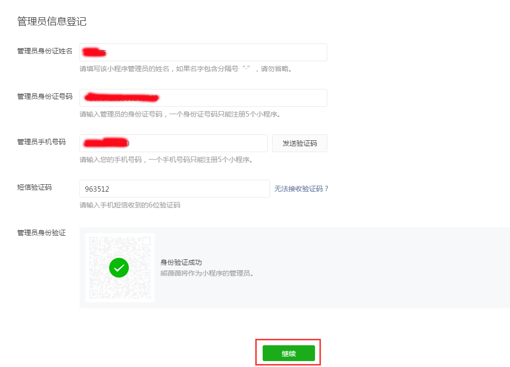 第七步:繼續(xù)往下填寫管理員信息。建議填寫后期企業(yè)具體管理微信小程序的運營人員信息。管理員身份認證需要用管理員的微信掃提示的二維碼。全部填寫后,點擊【繼續(xù)】。